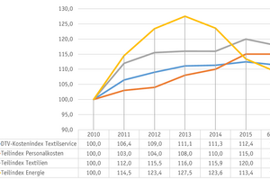 Nach dem kontinuierlichen Anstieg des Index in den letzten Jahren, zeigt sich für das 1. Halbjahr 2016 erstmalig eine leichte Entspannung. Für die ersten 6 Monate sank der Index um 1,0 Punkte. Damit liegen die Kosten des Textilservice im Trend