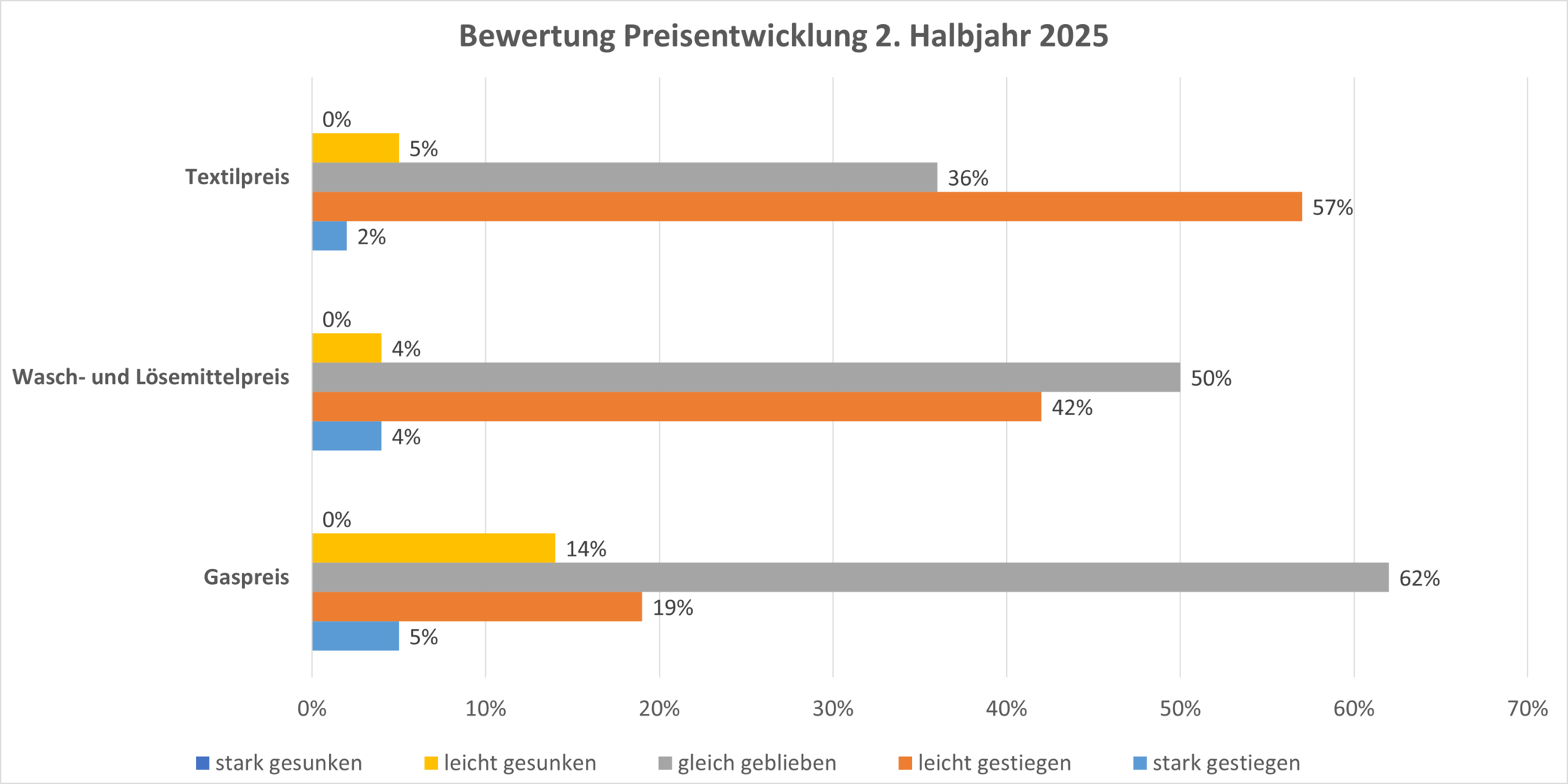 Knapp 60 Prozent der Betriebe gaben an, von höheren Einkaufspreisen für Textilien betroffen zu sein, während 46 Prozent berichteten, von steigenden Preisen für Wasch- und Lösemittel betroffen zu sein. Von höheren Gaspreisen berichteten 24 Prozent der Befragten. Für das erste Halbjahr 2026 erwartet die Branche einen stärkeren Preisanstieg bei Gas sowie bei Wasch- und Lösemitteln, während der Anstieg der Textilpreise deutlich geringer erwartet wird.