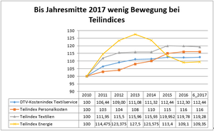 BONN, 14. September 2017 - Mitte 2017 lag der Kostenindex auf dem Niveau des Jahres 2015 und war damit in den vergangenen beiden Jahren relativ konstant. Damit liegen die Kosten des Textilservice jedoch voll im Trend der gesamten Erzeugerpreisentwicklung, die nach Angaben des Statistischen Bundesamts 2016 sogar um 1,7 Prozent gesunken sind. Zwischen 2010 und Mitte 2017 haben sich die Gesamtkosten um rund 12,4 Prozent gesteigert.