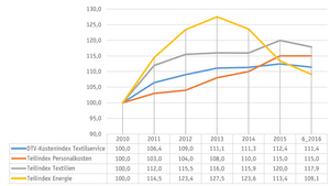 Bei der in der Produktion verwendeten Energie sind die Strompreise zwar nicht gesunken, wohl aber Gas und Öl, sodass der Teilindex für die Energie von 113,4 (2015) auf 109,1 Punkte (30.6.2016) sank. Das ist auch einer der wesentlichen Gründe für die Preisreduzierung bei den Textilien insgesamt, wobei die importierten Textilien deutlich preiswerter geworden sind. Leichte Kostensteigerungen gab es dagegen bei den Investitionsgütern, beim Wasser und bei den Waschmitteln.