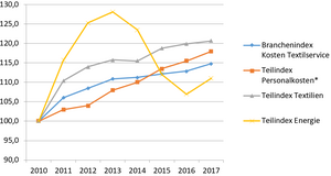 Darüber hinaus sind aber auch viele andere Kostenfaktoren im Jahresverlauf gestiegen. Dazu zählen bspw. die Textilpreise von inländischen Partnern bei der Berufsbekleidung und auch der Flachwäsche. Bei den Energiekosten entwickelten sich die Strompreise nach oben. Auch Öl zog zuletzt an, sodass der Teilindex Energie erstmals seit 2013 wieder anstieg.