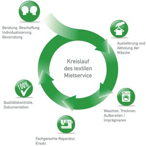 Zertifizierte Prozesse in den Wäschereien, ein nachhaltiger Service-Kreislauf und eine ausgeklügelte Logistik sorgen für eine hygienische und sichere textile Versorgung. Die Textilen müssen nicht länger von den Unternehmen gekauft werden, sondern werden von dem Dienstleister bereitgestellt - das macht finanzielle Ressourcen frei und entlastet die Mitarbeiter.